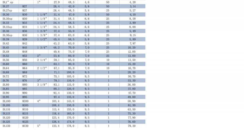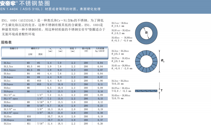 不銹鋼墊圈(EN 1.4404 / AISI 316L),DL3SS—DL42SS(標(biāo)準(zhǔn)尺寸)和DL45SS—DL80SS(根據(jù)要求定制)。